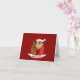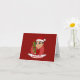 Cartão de saudação com ilustração de um menino pequeno sorridente e feliz, ele está usando um terno de Papai Noel vermelho e branco e segurando um presente; com um modelo de texto editável para o seu nome ou mensagem, design de férias de Natal com fundo vermelho