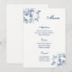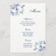 Cartão de Menu mostrado em papel básico em branco com um adorável impressão floral azul. Script e texto padrão em azul. Personalize os itens de menu clicando no botão personalizar, procure à direita e encontre as caixas apropriadas para alterar suas informações. Imagem do stock freepik.com