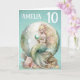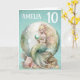 Sereia Cartão de Aniversário - Uma bela e longa sereia de cabelos justos, flores rosa pálidas em seu cabelo e em seu corpo, sua cauda é feita de escamas verdes e douradas, brilhando no mar cintilante. Ela está sentada sobre uma rocha, segurando uma grande orbe verde e branca. O que é dentro? Pode ser uma pérola, algum ouro ou outro tesouro misterioso. Você pode adicionar o nome da sua sereia precioso junto com o fazer da idade dela, este é um cartão único e mágico. Dentro é uma mensagem personalizável, o padrão diz, "desejando um aniversário mágico."