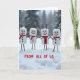 The different textures of the marshmallows, twigs, and scarves bring depth to the composition. The mix of red tones in the scarves adds a unique touch to each character. In the front, the words "FROM ALL OF US." in bold red letters bring a personal touch to the scene, making it a heartfelt holiday greeting from a group. This card is perfect for spreading holiday cheer and goodwill. 🎅🏼🎄🎁
