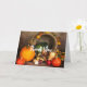 Cartões de agradecimentos com fotografia de uma colheita de Ação de Graças, colocada numa mesa de madeira rústica. Abóbora, batatas, abóbora, etc... constituem esta bela coleção de comidas. Folhas coloridas do outono rodeiam a cesta da cornucopia.