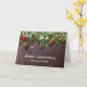 Cartão de Natal com uma fotografia rústica de uma mesa marrom de madeira com pinecones, agulhas de pinheiros, neve e Enfeites de natal. Festivo e adorável.