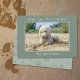 Sinto falta do cartão para compartilhar digitalmente. Sinto muito falta de você com texto personalizado. Um poodle branco está coberto de areia e olha para uma bola na praia. Ao longo do topo, o texto é, "Sem você, eu estou uma bagunça real". Por baixo da imagem, outra linha de texto diz, "Sinto muito sua falta". Personalize o texto como quiser e mude a foto. Cor verde de sábio com padrão de impressão de pata ao contrário.
