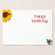 Cartão de aniversário de folha de ouro em damascos brancos sentados em girassóis e folhas verdes. Personalize o cartão de aniversário com a idade da aniversariante. Dentro do cartão há mais dois damybugs com girassol e um ramo verde de folhas, juntamente com o "feliz aniversário" escrito em ladybug red.