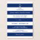 Convite náutico dobrado para casamento com um cobrir de folha de ouro com seus nomes e uma âncora em branco. Dentro, o texto do convite é escrito em listras de branco e marinho azul e outra âncora. A parte de trás apresenta um fundo branco com uma âncora e suas iniciais em folha de ouro.