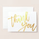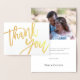 Diga obrigado aos seus convidados de casamento em estilo glamouroso com este design tipográfico com Obrigado na frente em um roteiro elegante impresso em folha real na sua escolha de prata ou ouro. Dentro, personalize facilmente com seu nome e obrigado a mensagem e substitua a foto da amostra de modelo com seu próprio favorito do dia especial.