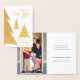 O cartão de feriado moderno apresenta "desejando um Legal Yule" em um texto elegante de folha de alumínio dourado no canto superior direito sobre três árvores geométricas douradas em grandes, médias e pequenos tamanhos em fundo branco. Personalize-o adicionando seu nome de família que aparecerá perto da parte inferior direita no tipo ouro. Dentro a placa, substitua a foto do exemplo por sua e personalize a saudação e os nomes na barra lateral. Para ver o design em outros itens, clique no link "Artes Rocklawn". Direitos autorais da design de cartão ©Claire E. Skinner. Todos os direitos reservados. Fotografia © Storytree Studios, Stanford, CA