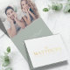Um cartão de saudação de folha de ouro para fotos na moda, moderno, com seu sobrenome em tipografia clássica, emparelhado com uma letra manuscrita, em branco, sobre fundo de folha de ouro. Sua foto especial ficará linda nessa design única, moderna e mínima. O design apresenta um verde-sábio maravilhoso no dentro. Uma design divertida e mínima para se destacar da multidão nesta temporada de natal! A imagem mostrada é apenas para fins de ilustração para ser substituída pela sua própria foto. A imagem marcante é de um belo e feliz casal se deitando juntos, descansando sobre seus cotovelos, no chão de sua casa neutra moderna.