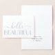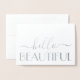 Envie notas elegantes para qualquer ocasião com cartões de nota dobrados com folha de prata Hello Beautiful. Todo o texto neste modelo é simples de personalizar ou excluir, e os estilos de fonte podem ser alterados com a ferramenta de design da Zazzle. O design minimalista moderno e elegante apresenta folha de prata metálica real na frente, caligrafia estilosa e tipografia em estilo art déco vintage. Esses cartões personalizados elegantes podem ser personalizados como cartões de agradecimento, cartões de "pensando em você" ou para qualquer finalidade de sua escolha.