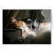 O gato Calico dorme inclinado contra um livro em um raio de sol do cartão com fotos da janela