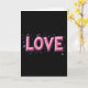 This greeting card centers on the word “LOVE” in large, uppercase letters that fill most of the front. The letters are hot pink and magenta, set on a deep black background, and they look slightly raised because they’re made of many thin horizontal lines. Around the edges, the word breaks into small streaks and specks of neon pink, cyan, and electric blue, like a digital flicker spreading outward. The “LOVE” text sits right in the middle, and its letter style feels modern and sharp, with bright color that stands out clearly against the dark. Even without any characters or a scene, the design feels like a strong, honest way to say what’s in your heart ❤️. It’s meaningful because it keeps the message simple, but the shifting colors and little fragments make it feel alive and real, like love can be intense and a bit messy 🥰.