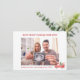 Um simples cartão de férias minimalista para anunciar sua gravidez. Este cartão de Natal apresenta um fundo branco com um texto de máquina de escrever vermelho profundo. Personalize todo o texto e a foto para criar o anúncio perfeito de gravidez de feriado. A imagem é apenas para fins de posicionamento, substitua-a pela sua própria foto. #holidaygestancyanunciado #christmasgestancyanunciado