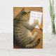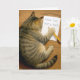 Chubby tabby cat writing a note on white paper with a yellow pencil on a wooden floor