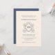 o design mostra um convite elegante ao casamento em caligrafia azul empoeirada e tipografia e uma crista floral no meio com iniciais de casal dentro dele. Esta design é extremamente elegante e será uma escolha única e clássica para o seu casamento.