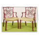 O mogno de Chippendale que jantam cadeiras no gosto chinês, os trilhos superiores superados por um coronet ducal e o griffon crest, c.1760 situado no museu Karlsplatz de Wien, Viena, Áustria.