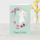 Na frente deste cartão de saudação de Páscoa, um quadro oval dourado com flores cor-de-rosa e beija-flores encerra um adorável coelho branco. O coelho está de pé para cheirar uma das flores cor-de-rosa. Na parte inferior está o texto verde que diz "Felz pascoa". Tudo é colocado sobre um fundo verde de menta mais claro. O dentro da placa tem vários campos de texto para personalizar ou você pode optar por deixar a saudação como ela é. Bonita!