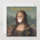 Mona Lisa soprando chiclete rosa. Texto "Feliz Aniversário" em dourado.