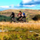 Uma aquarela de três homens pedalando nas colinas galesas.