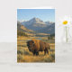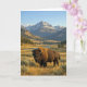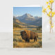 This breathtaking wildlife landscape features a majestic American bison standing in a wide golden valley surrounded by towering mountain peaks. Warm sunlight illuminates the prairie grasses while a winding river flows gently through the open landscape. Pine forests frame the valley and lead the eye toward rugged snowcapped mountains rising beneath a clear blue sky. The realistic wildlife photography style highlights the natural beauty of North American wilderness and the powerful presence of the bison. Rich earth tones, prairie gold, forest green, and cool mountain blues create a calm and scenic outdoor atmosphere inspired by the expansive landscapes of the American West.