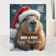 Mande uma alegria de Natal da Capy nesta temporada de festas com este cartão de Natal engraçado com o animal de frio favorito de todos - a capybara! Escondida num chapéu festivo de Santa e rodeada por flocos de neve, esta carta traz uma dose extra de humor para os seus cartões de natal. Perfeito por adicionar um toque peculiar às suas tradições natalinas, é certo que alguém que ama capibaras e aprecia um pouco de diversão de Natal reluzente!