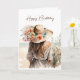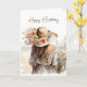 Pintura em aquarela de uma mulher com uma praia que olha para a água do oceano por um aniversário. O texto é editável.