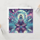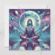 Cartão de meditação para um amigo de membro da família. Voltar é uma página colorida de mandala. Uma bela e serena ilustração aérea relaxante de uma cena azul e roxa com uma mulher medicando em frente à lua, planetas, estrelas e galáxia para lhe dar uma vibração pacífica. Bonito para uma sala de meditação ou um estúdio de yoga.
