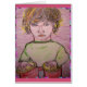 um jovem tocando bongos de brinquedo a partir de um desenho colorido de lápis. também o slogan "bongo music"
