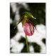 Uma fotografia de perto de um Slipper de Senhora rosa que cresceu à sombra de uma árvore.