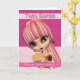 Cartão de aniversário bonito com menina do aniversário, composição e estojo compacto, roupa na moda e cores do cabelo