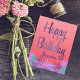 Este design de cartão de saudação de aniversário apresenta as palavras "FELIZ BIRTHDAY" escritas em uma letra de script de caligrafia com letra de gradiente roxo, num fundo botânico cor-de-rosa.