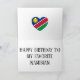 O belo design inclui balões felizes e fitas de cócegas com as palavras "Parabéns", cobertas nas cores da bandeira da Namíbia. Design está acabado com o coração nas cores da bandeira da Namíbia e a mensagem de aniversário. Os elementos são totalmente personalizáveis usando o recurso "Personalizar!". Este cartão de aniversário colorido é o presente perfeito para o seu amigo da Namíbia. © PaísesDoMundo