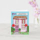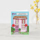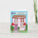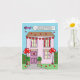 Uma casa de desenho decorada com balões de bunting e de forma vermelha de coração. Há um avião a sobrevoar a casa e atrás do avião voa uma faixa que diz "Feliz dia de os namorados a uma neta especial que está fora da faculdade".
