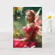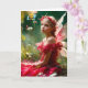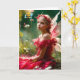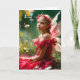 Uma linda jovem fada com asas delicadas e um vestido vermelho está sentada em meio a um jardim exuberante com flores e folhas ao seu redor. Ela usa uma coroa floral e olha pensativamente para a distância, banhada por uma luz suave e natural. Ela parece tão triste que uma abelha que passa explode em torrentes de lágrimas.