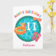 Cartão de aniversário personalizado de 11 de Verão para raparigas que apresenta um design colorido na frente do cartão com um chinelos de pato flutuativo, cor-de-rosa, óculos de sol e uma piscina. Você poderá personalizar facilmente o cartão com a idade de aniversário, o nome e a mensagem de dentro. Um cartão de aniversário de 11 de verão colorido personalizado para filha, neta etc.