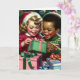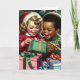 Cartão de Natal bonito com duas crianças alegres abrindo seus presentes na manhã de Natal.