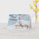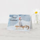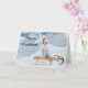 Lindo poodle branco em um trenó em um fundo nevado usando um cartão de Natal de um cão com chapéu de Papai Noel para amantes de cães