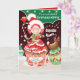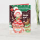 Um doce cartão de Natal para a neta. A princesa cupcake Marcy Pam está vestida para o feriado. Vestindo um chapéu de Papai Noel e um cachecol verde e carregando uma bengala doce, ela se senta sobre seu cupcake soprando beijos alegremente. Ao lado dela está um sorridente cupcake de renas de chocolate, e poleiro em cima de sua bengala doce é um pequeno assaltante.