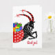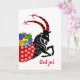 Cartão dianteiro feito sob encomenda do Natal redigido no norueguês. O deus julho no cobrir pode ser alterado por você se desejado e uma mensagem pessoal incluída para dentro. A ilustração da cabra de Yule, Julbukk, ilustração corajosa no contraste alto colore mostrar uma cabra com os chifres envolvidos na fita vermelha e levar um cheio do saco do presente dos presentes. Vazio para dentro. Arte, imagem, e estúdios de Shoaff Ballanger do © dos direitos reservados do verso.