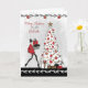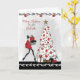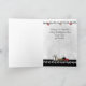 Cartão de Natal moderno para madrinha, apresentando uma senhora elegante vestida de vermelho com salto alto carregando presentes em direção a uma bela árvore de Natal branca decorada. Gráficos cedidos por Crave Designs.