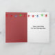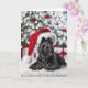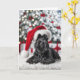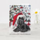 Um cão negro escocês aterrorizante vestindo um chapéu de Papai Noel sentado em um tapete liso em frente a uma festiva árvore de Natal enfeitiçada com luzes e arcos vermelhos. O texto pode ser alterado.