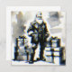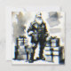 Temática navideña con figura de Papá Noel estilo macarra rodeado de cajas de regalos. Ilustración de acuarela en tonos grises y efecto envejecido. Enmarcado postal felicitación.
