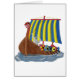As velas azuis e amarelas voam acima desta embarcação de viquingue. Os protetores decoram o lado. Saques do monstro de mar no leme.