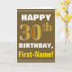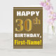 Este simples design de cartão de saudação com tema de aniversário apresenta um desejo de aniversário quente como "FELIZ aniversário de 30 anos, Primeiro Nome!" na frente, em texto a negrito sobre fundo castanho. O número de aniversário tem uma aparência falsa e imitada de cor dourada. O nome na frente pode ser personalizado. O dentro apresenta uma mensagem de aniversário personalizável. Um cartão de saudação como este poderia ser uma maneira divertida de fazer votos de aniversário a alguém que comemora seu trigésimo aniversário. [~Z0000281]