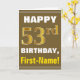 Este simples design de cartão de saudação com tema de aniversário apresenta um desejo de aniversário quente como "HAPPY 53rd BIRTHDAY, First-Name!" na frente, em texto a negrito sobre um fundo castanho. O número de aniversário tem uma aparência falsa e imitada de cor dourada. O nome na frente pode ser personalizado. O dentro apresenta uma mensagem de aniversário que pode ser personalizada. Um cartão de boas-vindas como este poderia ser uma maneira divertida de fazer votos de aniversário a alguém que comemora os seus cinquenta e três anos. [~Z0000281]