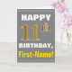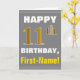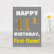 Este simples design de cartão de saudação com tema de aniversário apresenta um desejo de aniversário quente como "FELIZ 11 BIRTHDAY, First-Name!" na frente, em texto a negrito em um fundo de cinza (cinza) colorido. O número de aniversário tem uma aparência falsa e imitada de cor dourada. O nome na frente pode ser personalizado. O dentro apresenta uma mensagem de aniversário personalizável. Um cartão de boas-vindas como este poderia ser uma maneira divertida de fazer votos de aniversário a alguém que comemora o seu décimo primeiro aniversário. [~Z0000283]