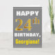 Este simples design de cartão de saudação com tema de aniversário apresenta um desejo de aniversário quente como "FELIZ 24º ANIVERSÁRIO, Georgiana!" na frente, em texto ousado sobre uma cinza (cinza) de fundo colorido. O número de aniversário tem uma aparência falsa e imitada de cor dourada. O nome na frente pode ser personalizado. O dentro apresenta uma mensagem de aniversário que pode ser personalizada. Um cartão de boas-vindas como este poderia ser uma maneira divertida de fazer votos de aniversário a alguém que comemora o seu vigésimo quarto aniversário. [~Z0000283]