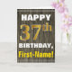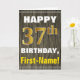 Este simples design de cartão de aniversário apresenta um caloroso desejo de feliz aniversário como "FELIZ ANIVERSÁRIO DE 37 ANOS, Primeiro-Nome!" na frente, em negrito sobre um fundo com padrão de aparência de madeira falsa. O número do aniversário tem uma aparência de coloração dourada falsa/imitada. O nome na frente pode ser personalizado. O interior apresenta uma mensagem de aniversário personalizável. Um cartão de aniversário como este pode ser uma maneira divertida de enviar desejos de feliz aniversário para alguém que está celebrando seu trigésimo sétimo aniversário.