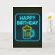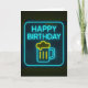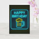 Sinal de neon com uma design gráfica aqua brilhante e amarela de uma caneca de cerveja sobre fundo preto para um aniversário. O dentro de texto é editável