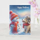 Um boneco de neve vestindo um chapéu vermelho e cachecol segura um cone de sorvete para um cachorro pequeno vestido de inverno correspondente Texto pode ser mudado.