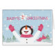 Celebre o primeiro Natal de uma menina com um doce boneco de neve pegando flocos de neve com sua língua. Menina rosa, bonitão, está encantada com o primeiro Natal!